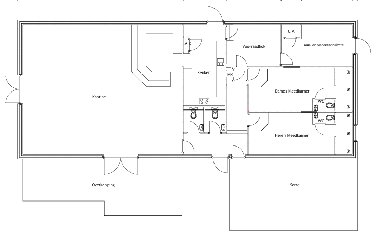 We hebben in overleg met de gemeente besloten ook de indeling te veranderen. Dat betekend dat het zowel de heren- alsook de dames kleedkamer een rechte ruimte wordt. Doordat het bergingshok met de wateropslag verplaatst wordt (zit nu voor de heren kleedkamer) verliezen we niet heel veel ruimte ruimte in beide kleedkamers. We krijgen wel een groter voorraad- en aanvoerruimte hiervoor terug.